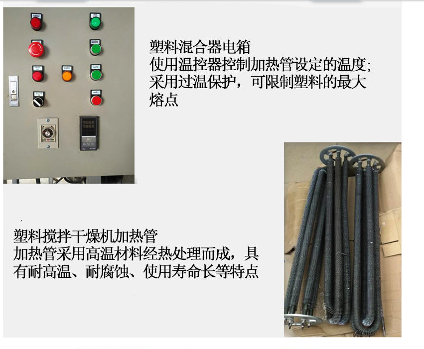 9、干燥混合功能二合一,當(dāng)不需要干燥時,只需將“加熱開關(guān)及“及風(fēng)機(jī)開關(guān)”關(guān)閉,本系列機(jī)型即可用于塑料攪拌均化用途,一機(jī)二用。